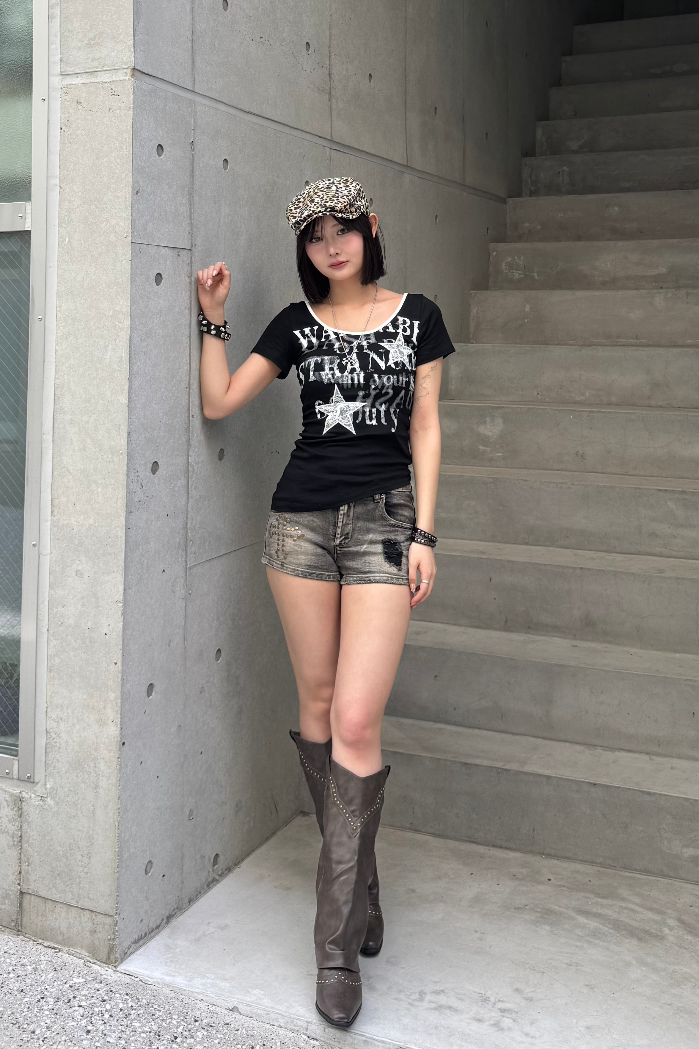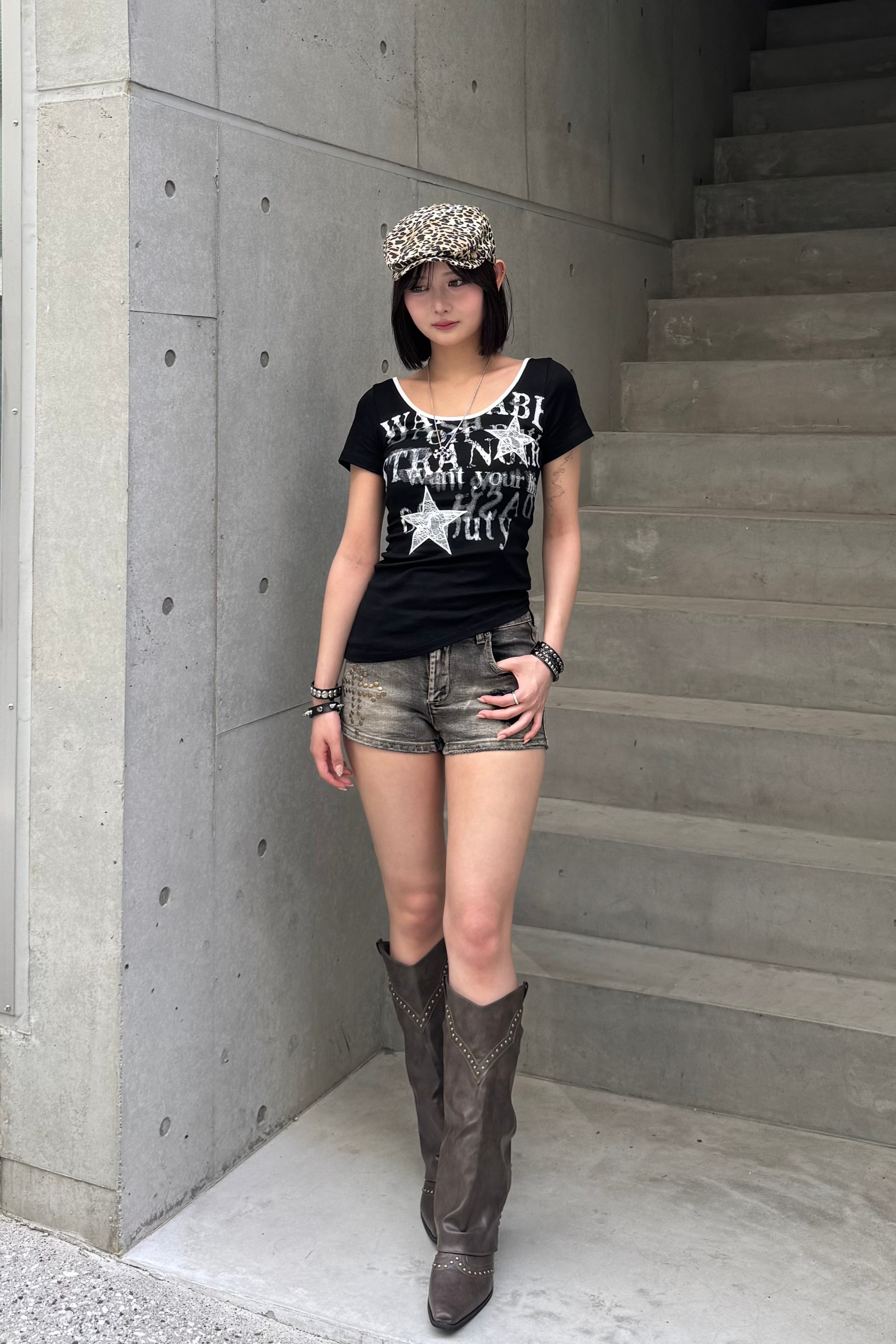 今年トレンドのショートパンツ✖️ウエスタンブーツの合わせ方が超おしゃれ! カモフラージュ柄などの柄物を持ってくると、周りと被らないY2Kコーデに変身します❤︎